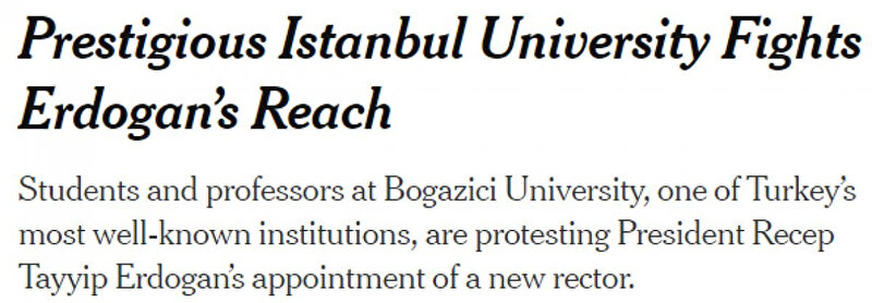 Gazete, protestolardan fotoğraflara yer vererek, Cumhurbaşkanı Erdoğan'ın söz konusu üniversiteyi kontrol altına almaya çalıştığını iddia etti.