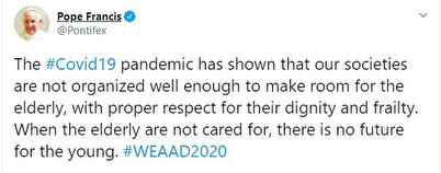 - Sosyal medya hesabından açıklama yapan Papa Francis, “Covid-19 salgını, genç insanların yaşlılara, haysiyetlerine ve kırılganlıklarına uygun saygı gösterecek kadar iyi organize olamadıklarını" ifade ederek, "Yaşlılara ilgilenilmezse, gençlerin de geleceği yoktur” dedi.