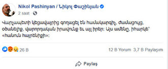 Facebook hesabı üzerinden açıklama yapan Ermenistan Başbakanı, gece yaşanan eylemler esnasında bilgisayar, saat, parfüm ve ehliyetinin çalındığını söyledi.