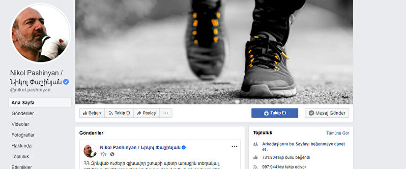 Paşinyan ailesinin Facebook paylaşımları gündem olmaya devam ediyor. Ermenistan Başbakanı Nikol Paşinyan'ın Facebook profilindeki fotoğraf alay konusu oldu. Paşinyan'ın resmi Facebook profilindeki "koşan ayak" fotoğrafı sosyal medya kullanıcılarını tarafından "Paşinyan kaçın mesajı mı veriyor" şeklinde yorumlandı.
