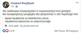 Ermenistan Başbakanı Nikol Paşinyan'ın kızı Mariam Paşinyan'ın, Facebook hesabından yaptığı paylaşıma tepki yağdı. Mariam Paşinyan Facebook postuna "Hayallerimiz ve hedeflerimiz başarısız oldu. Hayallerimiz askerlerimiz ve vatanımız hakkındaydı" yazdı. Mariam'ın "karamsar" olarak nitelenen paylaşımına tepki gösteren Ermeniler bu tür paylaşımların "cephedeki askerlerin moralini bozduğunu" iddia etti.