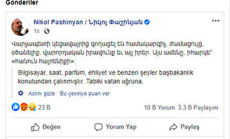 Ermenistan Başbakanı Nikol Paşinyan'ın gece yaşanan eylemler esnasında bilgisayar, saat, parfüm ve ehliyetinin çalındığını duyurması Ermenistan halkını kızdırdı. Paşinyan'ın Facebook paylaşımında binlerce yorum yapan Ermeniler, " Topraklarımız gitti başbakan parfüm diyor!" diyerek tepki gösterdi.