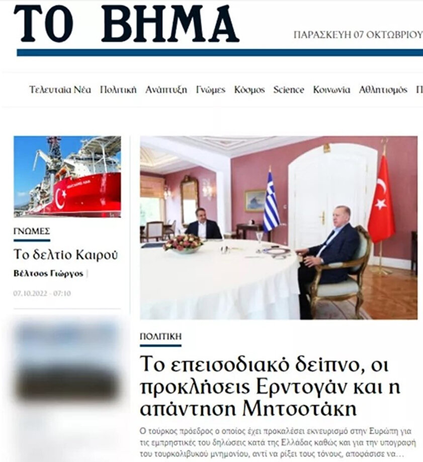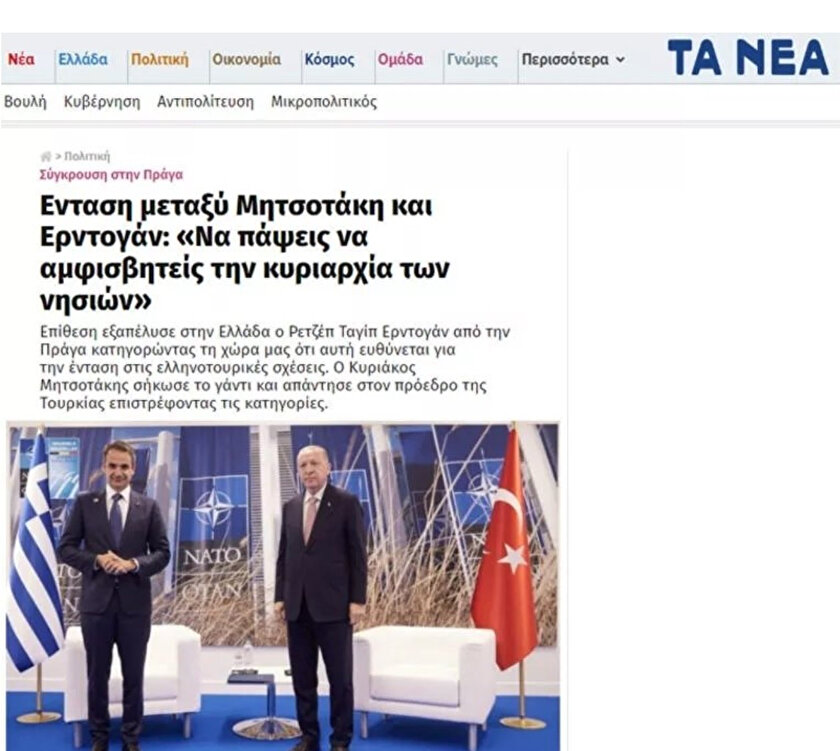 Prag'da düzenlenen Avrupa Liderler zirvesinde Başkan Erdoğan'ın Yunanistan'a resti Yunan basınında manşetlere taşındı. Erdoğan'ın "Bir gece ansızın gelebiliriz" sözlerini manşetlerine taşıyan Yunan medyası 'Prag'da çatışma', 'Olaylı akşam yemeği', 'Erdoğan-Miçotakis kavgası', 'TürkYunan ilişkileri kırmızıda' ve 'Türkiye'den olağanüstü meydan okuma' gibi başlıklar attı.