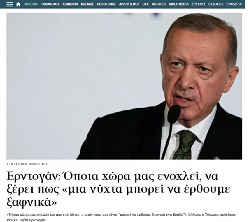 Ethnos gazetesi, "Erdoğan: Yunanistan'a söyleyecek sözümüz yok, bir gece gelebiliriz" başlıklı bir habere imza attı. Haberde, "Yunanistan, Recep Tayyip Erdoğan tarafından Avrupa topraklarından da tehdit edildi. Türk Cumhurbaşkanı, kendisini Prag'daki AB zirvesine davet eden Avrupalı liderlerin önünde Yunanistan'a yönelik 'bir gece ansızın geliriz' tehdidini tekrarladı." denildi.