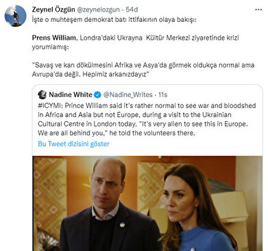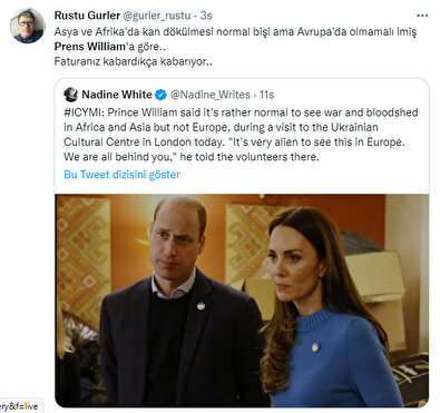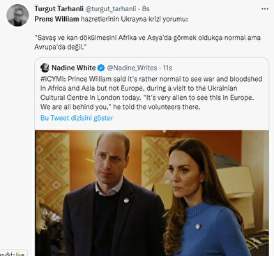 - Prens William'ın burada Ukrayna'daki savaşla ilgili yaptığı yorum sosyal medyada tepkiye neden oldu. Prens William, İngilizlerin Afrika ve Asya'da savaş ve kan dökülmesine daha çok alışkın olduklarını söyledi. William daha sonra, "Bunu Avrupa'da görmek çok yabancı. Hepimiz arkanızdayız"dedi. Yardım etmek için daha fazlasını yapmak istediğini ekleyerek, "Kendimizi çok işe yaramaz hissediyoruz" diye devam etti.