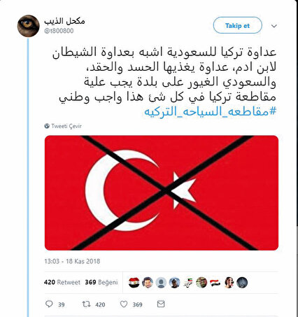 Suudi Arabistan’da da sosyal medya üzerinden Türkiye’yi boykot kampanyası başlatıldı. Geçmiş yıllarda düzenlenen terör saldırıları ve kaos görüntüleri bugün oluyormuşçasına servis edildi. Türkiye güvenli olmayan bir ülke olarak tanıtılırken, DEAŞ gibi terörist örgütlerin destekçisi olduğu iddia edilerek dezenformasyon yapıldı.