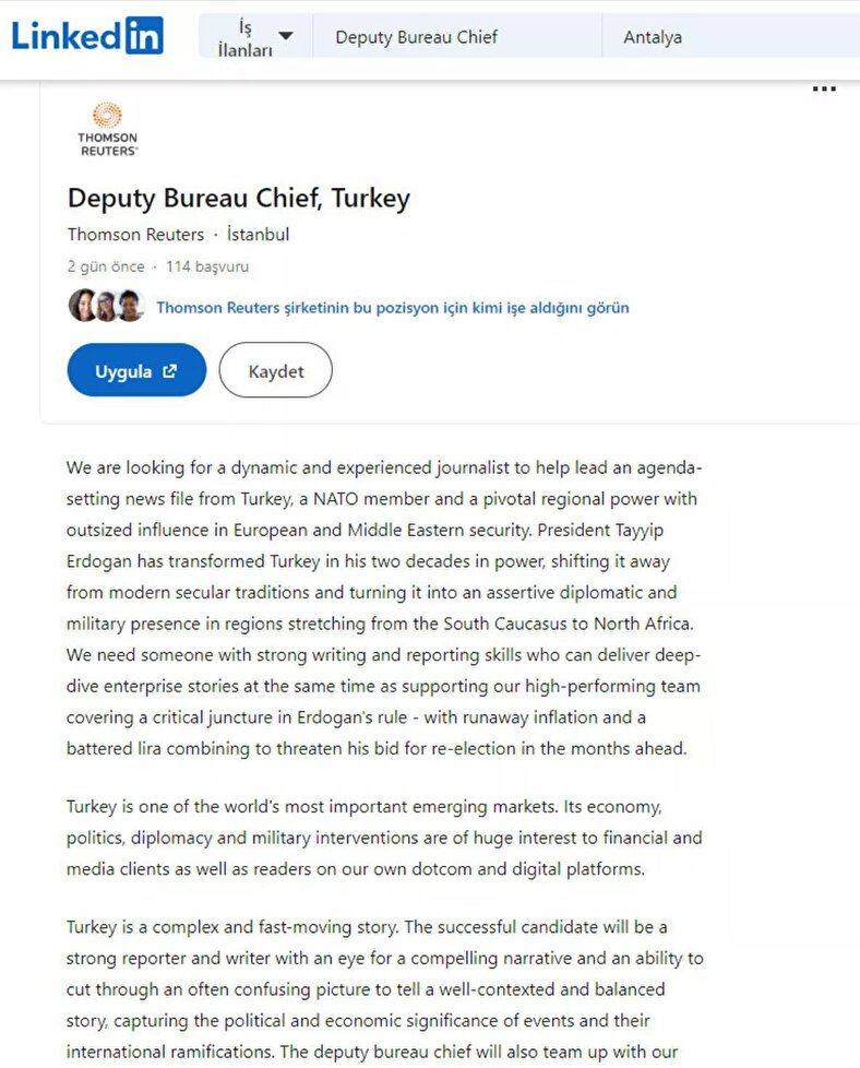 İngiltere merkezli haber ajansı Reuters tarafından yayınlanan bir iş ilanında Türkiye ve Cumhurbaşkanı Erdoğan düşmanlığı açıkça ortaya koyuldu. İlanda, Erdoğan'ın Türkiye'yi bölgede iddialı diplomatik ve askeri varlığa dönüştürdüğü vurgulandı. Reuters, söz konusu ilanda açıkça Erdoğan düşmanlığı yapabilecek birini aradığını duyurdu.