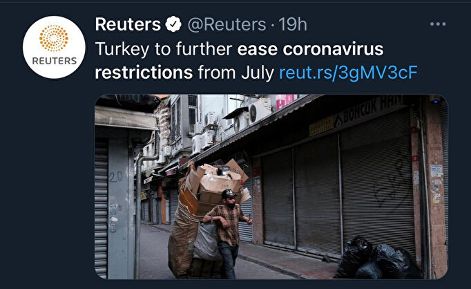 Reuters Almanya, İrlanda gibi Avrupa ülkelerindeki normalleşme haberlerini duyururken, sokak ve park fotoğrafları kullanırken Türkiye'nin normalleşme kararlarını kepenkleri indirilmiş dükkanların bulunduğu bir fotoğrafla duyurdu.