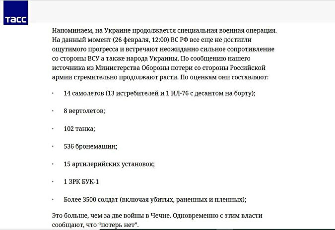 TASS'ın paylaşıp daha sonra silmek zorunda kaldığı duyuruya göre; Rusya, 14 uçak (13 savaş uçağı ve 1 IL-76), 8 helikopter, 102 tank, 536 zırhlı araç, 15 topçu tesisi, 1 SAM BUK-I ve 3 bin 500'den fazla asker kaybetti.