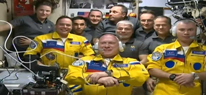 Uluslararası Uzay İstasyonu’na gönderilen üç Rus kozmonotun Ukrayna bayrağının renklerini taşıyan tulum giydiği bildirildi. Rus basınında ise Rusya’nın Ukrayna üzerinde hakimiyet kurduğu ve bunu uzaya taşımak istediği yorumları yapıldı.