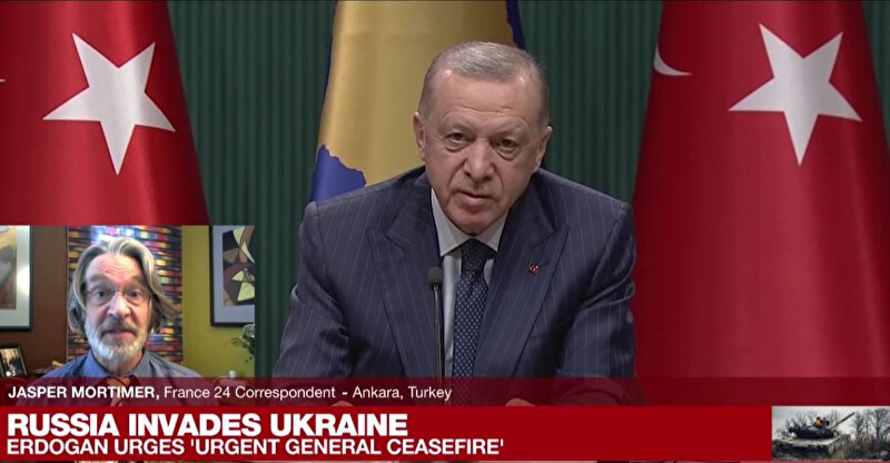 Fransa merkezli yayın kuruluşu, Ukrayna krizinde Türkiye-Rusya diyaloğunu yorumladı. France 24 ekranlarında Erdoğan-Putin diyaloğunu yorumlayan muhabir Jasper Mortimer, "Şu bir gerçek ki Erdoğan ve Putin anlaşabiliyor" dedi. Mortimer ayrıca Cumhurbaşkanı Erdoğan'ın Rusya liderinden "acilen" silahların susturulmasını ve insani koridorların açılmasını istediğini aktardı.