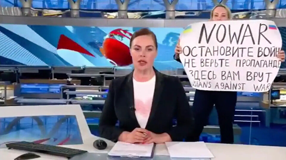 Rusya’da yayın yapan Kanal 1 televizyonunun canlı yayını sırasında "savaşa hayır" yazılı pankart açan Kanal 1 Editörü Marina Ovsyannikova sosyal medya hesabı üzerinden yatığı açıklamada, Ukrayna’da yaşananların bir suç olduğunu ve Rusya’nın saldırgan bir ülke olduğunu ifade etmesinin ardından Rus polisi tarafından gözaltına alındı.