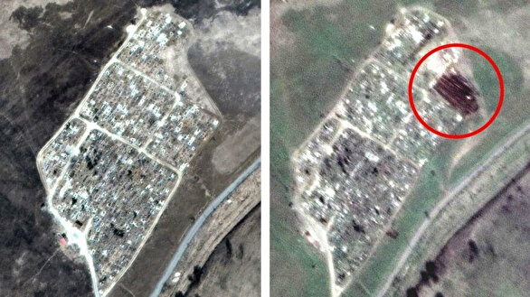 22 Mart’ta çekilen uydu görüntüsünde toplu mezarlık ya da kazı işlemi görülmezken 29 Mart’ta çekilen fotoğrafta ise mezarlık görülüyor.
