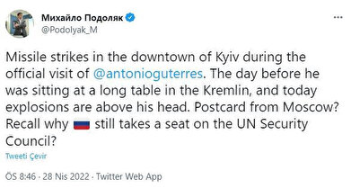 Cumhurbaşkanı Zelenski'nin danışmanlarından biri olan Ukrayna müzakere ekibinin başkanı Mykhailo Podolyak, BM Genel Sekreteri António Guterres'in resmi ziyareti sırasında Kiev şehir merkezindeki "füze saldırıları" hakkında Tweet attı.