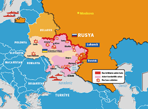 İlk füze saldırısı ile birlikte Rus birlikler, ayrılıkçıların olduğu Donetsk- Luhanks (Donbass) bölgesi, Kırım, Belarus sınırı olmak üzere 3 koldan kara harekatı da başlattı.