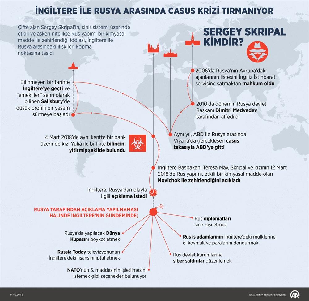 Zehirlenen ajan, Sergey Skripal'di. Yani eski bir Rus ajanı. Çifte ajan Sergey Skripal'in, sinir sistemi üzerinde etkili ve askeri nitelikte Rus yapımı bir kimyasal madde ile zehirlendiği iddiası, İngiltere ile Rusya arasındaki ilişkileri koparma noktasına taşıdı.