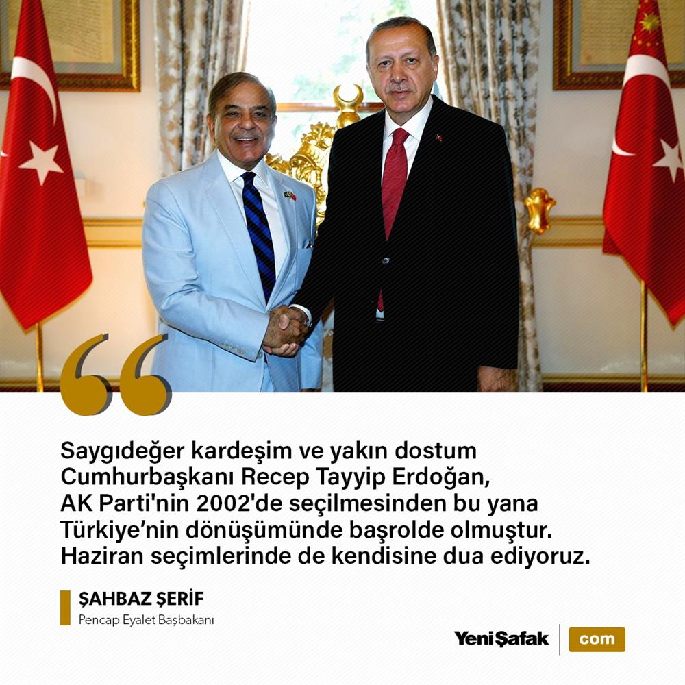 Türkiye-Pakistan ilişkilerini öven Pencap Eyalet Başbakanı Şahbaz Şerif, Cumhurbaşkanı Erdoğan'a seçimlerde başarılar diledi. Şehbaz Şerif, "Saygıdeğer kardeşim ve yakın dostum olan Cumhurbaşkanı Tayyip Erdoğan, AK Partinin 2002'de seçilmesinden bu yana Türkiyenin dönüşümünde baş rolde olmuştur" ifadelerini kullandı.