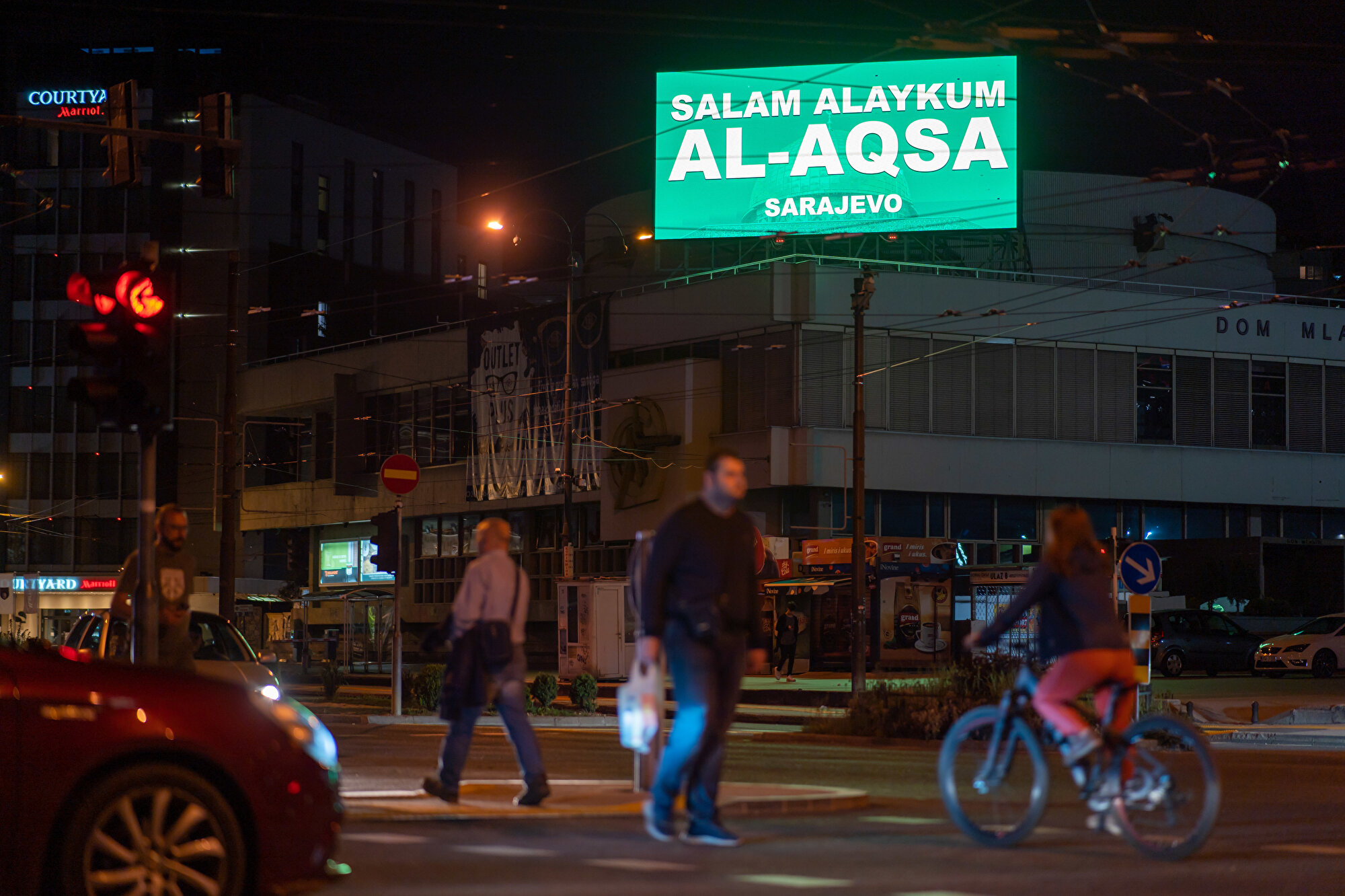 Bosna Hersek'in başkenti Saraybosna'dan işgal altındaki Doğu Kudüs'te İsrail polisinin saldırılarına maruz kalan Filistinlilere "Selamün Aleyküm Mescid-i Aksa" yazılı destek mesajı gönderildi.