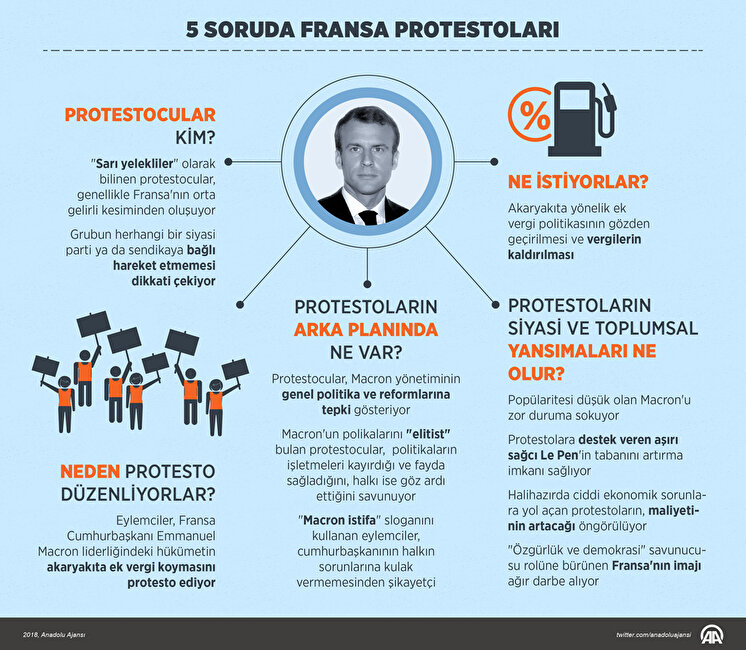 Fransa'da akaryakıt zamlarına ve ekonomik şartların kötüleşmesine tepki olarak 17 Kasım'da başlayan ancak daha sonra Macron yönetimine yönelik öfkeye ve isyana dönüşen sarı yeleklilerin eylemleri, ülkede son yılların en şiddetli protestosu haline dönüştü.