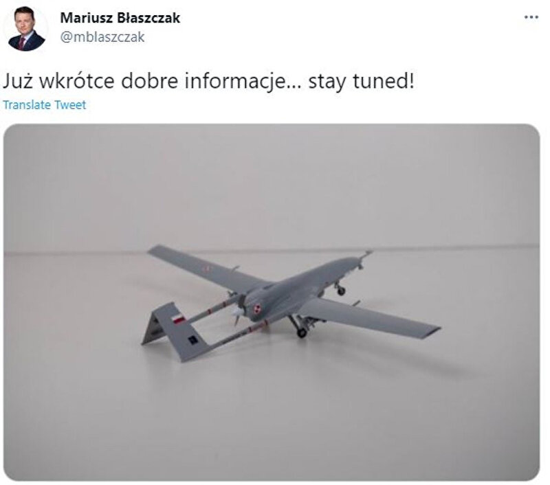 Blaszczak, Twitter hesabından yaptığı paylaşımda, üzerinde Polonya bayrağı bulunan Bayraktar TB2'ye yer verdi.