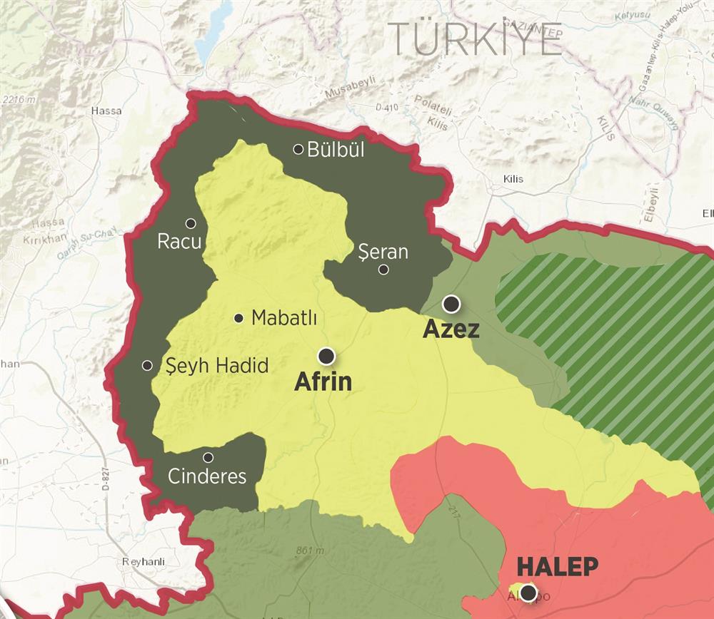 Afrin, bir ilçe merkezi ile Raco, Bülbül, Şeyh Hadid, Cinderesi, Şeran ve Mabatlı olmak üzere 6 belde merkezinden oluşuyor. TSK ve ÖSO unsurları, henüz Mabatlı beldesine yönelik hücum başlatmadı. Merkezleri ele geçirilen diğer beldelere ait bazı köylerin de harekatın ilerleyen safhalarında teröristlerden temizlenmesi bekleniyor. PYD/PKK, Zeytin Dalı Harekatı’nın işaretlerini aldığı dönemde yığınak ve savunma hatlarını büyük ölçüde Afrin ilçe merkezinde oluşturmuştu. Beldelerdeki sivilleri de canlı kalkan yapabilmek için ilçe merkezine taşımıştı.