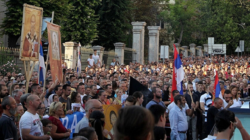 Geleneksel değerlerin korunması ve toplumun cinselleştirilmesine bir son verilmesi çağrısında bulunan kalabalığı Sırp Ortodoks Kilise Piskoposu Nikanor liderlik etmişti.