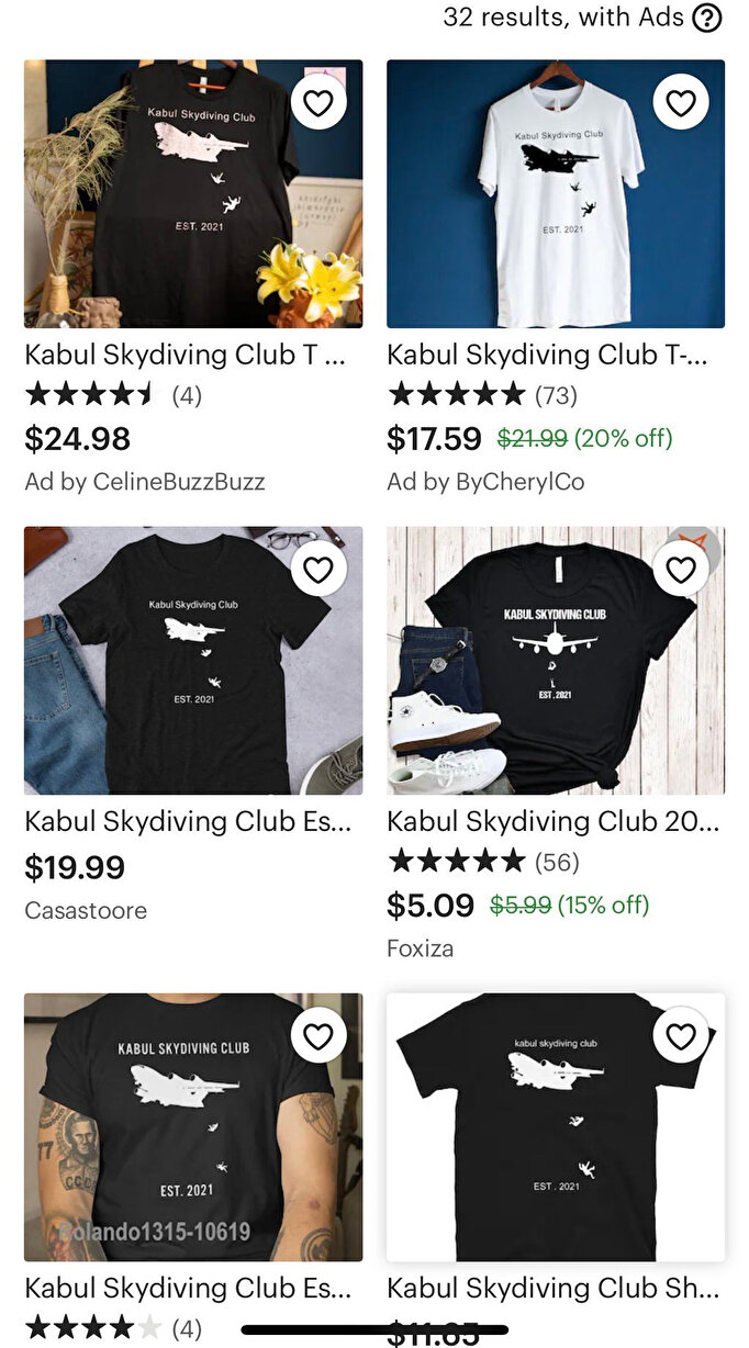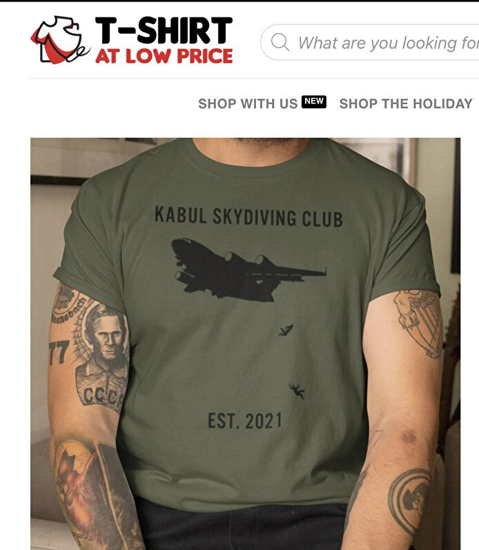 Afganistan'dan tahliye için havalanan ABD'ye ait askeri kargo uçağından düşerek hayatını kaybedenlerin tüm dünyayı sarstığı görüntülerin insanlık dışı bir şekilde ti'ye alındığı tişört tasarımları tepki çekti.