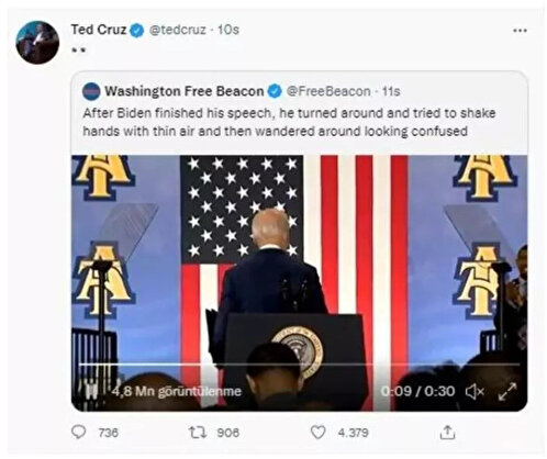 Biden'ın konuşmasını bitirmesinden dakikalar sonra 51 yaşındaki Texas Senatörü Ted Cruz sosyal medyaya düşen görüntüleri Twitter hesabından bir göz emojisi eşliğinde paylaştı.