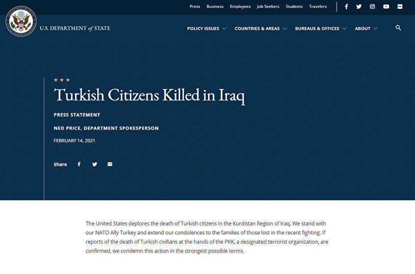 13 Türk vatandaşının ölümü sonrası ABD, bir kez daha iki yüzlü tavrını gözler önüne serdi. ABD Dışişleri Bakanlığı Sözcüsü Ned Price tarafından yayımlanan mesajda şu ifadeler kullanıldı: