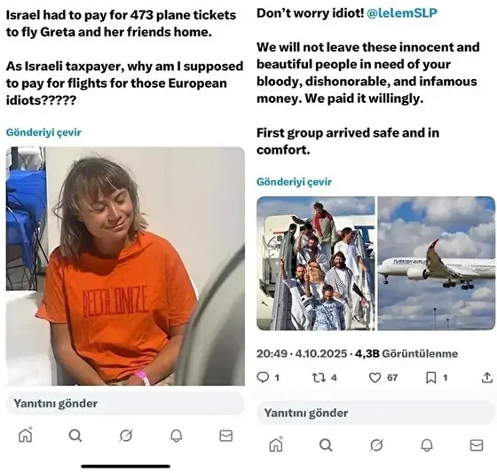 Sosyal medyadaki İsrail trolleri, Sumud Filosu aktivistlerinin uçak biletlerine takınca ABD'liler ağır yanıt verdi. Greta Thunberg'in fotosuyla paylaşım yapan troller, "Niye Greta ve arkadaşlarının uçak biletleri biz ödüyoruz?" diye sordu. Binlerce Amerikalı paylaşımcı bu trollere, "Siz değil biz ödüyoruz, vergilerimizle sizin soykırımınızı desteklemek zorunda mıyız?" karşılığını verdi.