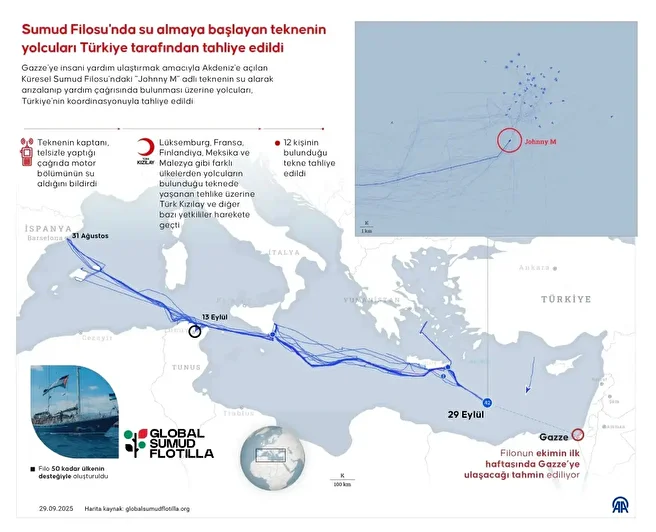 Gazze'ye insani yardım ulaştırmak amacıyla Akdeniz'e açılan Küresel Sumud Filosu’ndaki "Johnny M" adlı teknenin su alarak arızalanıp yardım çağrısında bulunması üzerine yolcuları, Türkiye'nin koordinasyonuyla tahliye edildi.