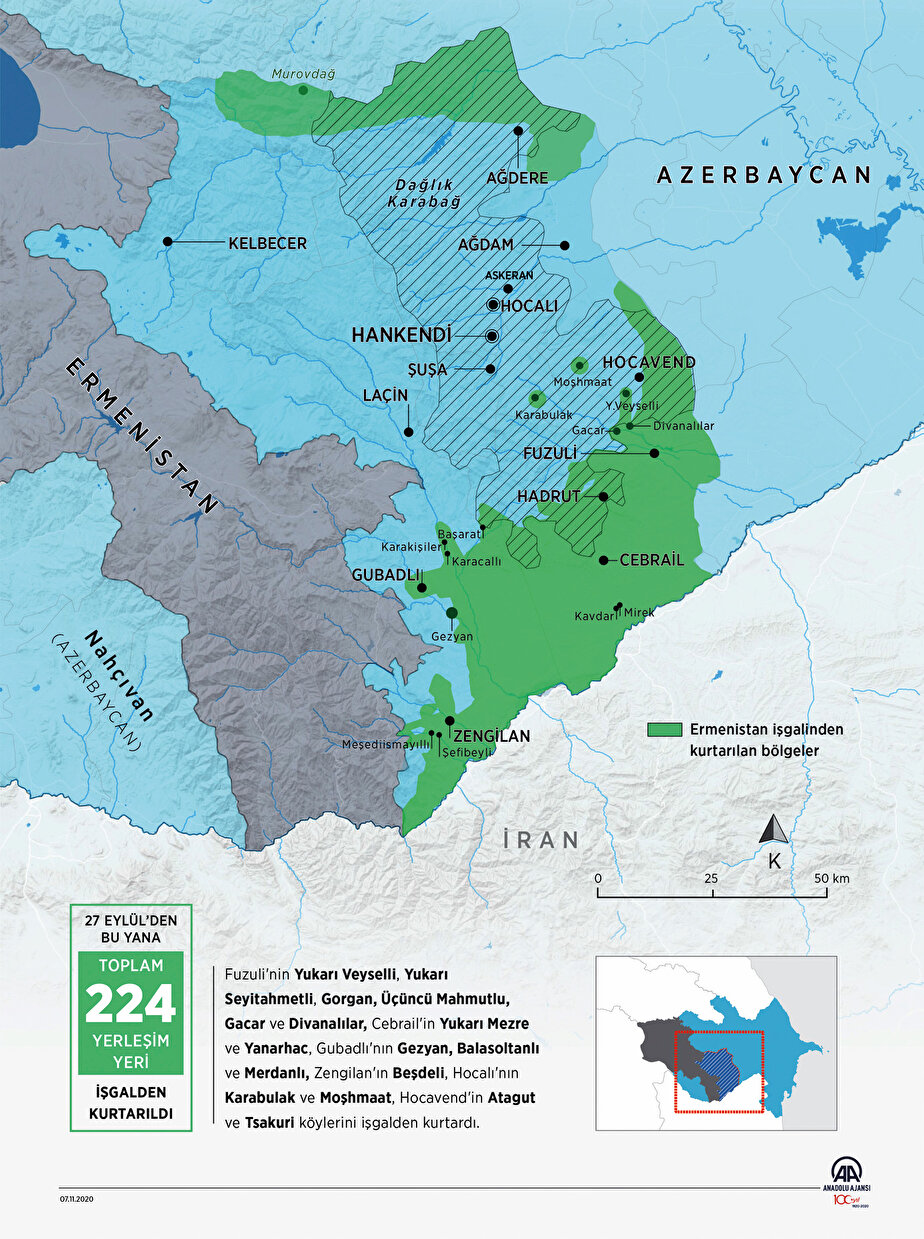 Azerbaycan Cumhurbaşkanı İlham Aliyev, Azerbaycan ordusunun 16 köyü daha Ermenistan’ın işgalinden kurtardığını duyurdu. Aliyev, Twitter hesabından, “Muzaffer Azerbaycan ordusu, Fuzuli’nin Yukarı Veyselli, Yukarı Seyitahmetli, Gorgan, Üçüncü Mahmutlu, Gacar ve Divanalılar, Cebrail’in Yukarı Mezre ve Yanarhac, Gubadlı’nın Gezyan, Balasoltanlı ve Merdanlı, Zengilan’ın Beşdeli, Hocalı’nın Karabulak ve Moşhmaat, Hocavend’in Atagut ve Tsakuri köylerini işgalden kurtardı. Yaşasın Azerbaycan ordusu. Karabağ, Azerbaycan’dır” paylaşımında bulundu. Azerbaycan ordusu, Dağlık Karabağ’da 27 Eylül’de başladığı operasyonda, 4 kent merkezi, 3 kasaba ve 200’den fazla köy ile bazı önemli tepeleri Ermenistan’ın işgalinden kurtarmıştı.