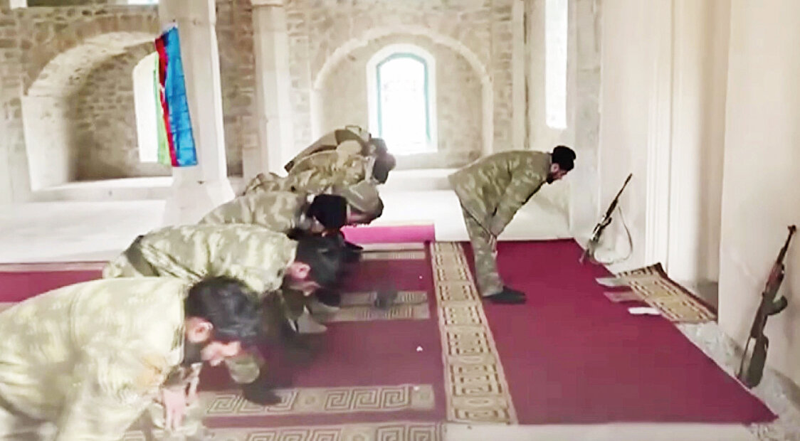 Azerbaycan’ın işgalden kurtardığı Dağlık Karabağ’ın sembol şehirlerinden Şuşa’da 28 yıl sonra ilk cuma namazı kılındı. Azerbaycan askerleri, Şuşa’daki tarihi Yukarı Gövher Ağa Camii’nde namazlarını eda etti. Cumhurbaşkanı İlham Aliyev “Tüm tarihi eserlerimizi, tüm camilerimizi restore edeceğiz ve Şuşa’da ezan tekrar duyulacak” diye müjde vermişti.