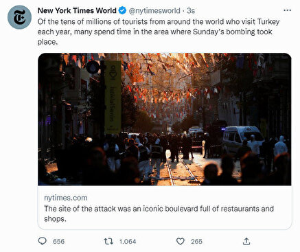 Amerikan gazetesi New York Times, İstiklal Caddesi'nde gerçekleşen hain saldırıyı 'turizm' vurgusu kullanarak servis etti. "Her yıl dünyanın dört bir yanından Türkiye'yi ziyaret eden on milyonlarca turistin çoğu, pazar günkü bombalamanın gerçekleştiği bölgede vakit geçiriyor." ifadelerinin yer aldığı paylaşım büyük tepki çekti. Amerikan gazetesi, tepkilerin ardından söz konusu paylaşımı kaldırdı.