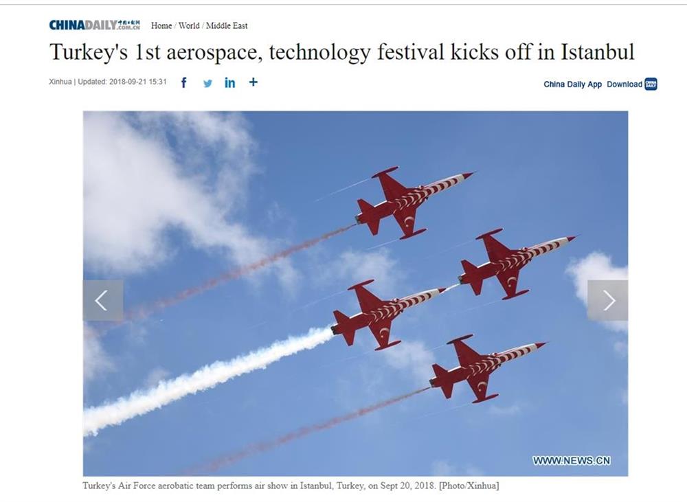 - Çin medyası da Teknofest’e uzak kalmadı. Xinhua haber ajansı internet sitesinde,“Türkiye’nin ilk havacılık, teknoloji festivali İstanbul’da başladı”manşetini kullandı. Hava gösterisinin fotoğrafı paylaşıldı, Sanayi ve Teknoloji Bakan Yardımcısı Mehmet Fatih Kacır’ın“Festival teknolojik ilerlemeyi ulusal bir amaç olarak tanıtmayı amaçlıyor.”sözlerine yer verdi.