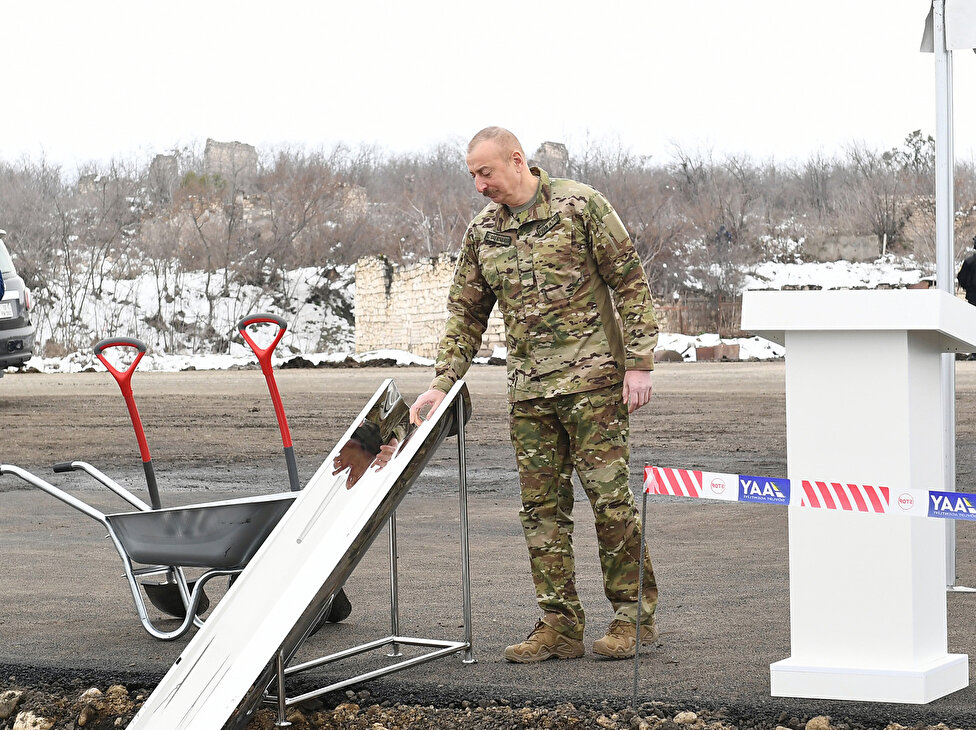 Azerbaycan Cumhurbaşkanı İlham Aliyev, Ermenistan'ın işgalinden kurtarılan bölgelere gerçekleştirdiği ziyaret kapsamında Fuzuli-Hadrut ve Hadrut-Cebrayıl-Şükürbeyli kara yollarının temelini attı.