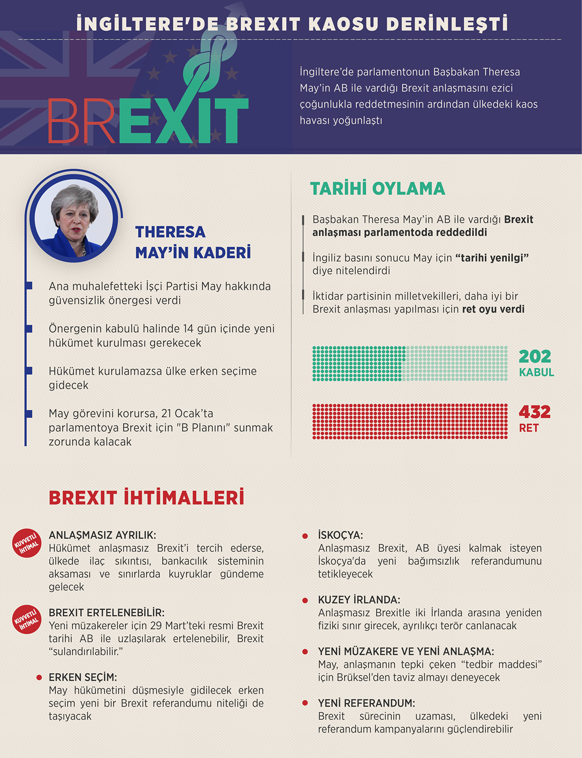 İngiliz parlamentosunda yapılan oylamada İngiltere Başbakanı Theresa May'in AB ile vardığı birlikten çıkış (Brexit) anlaşması 202 evet oyuna karşı 432 hayır oyu ile reddedildi.