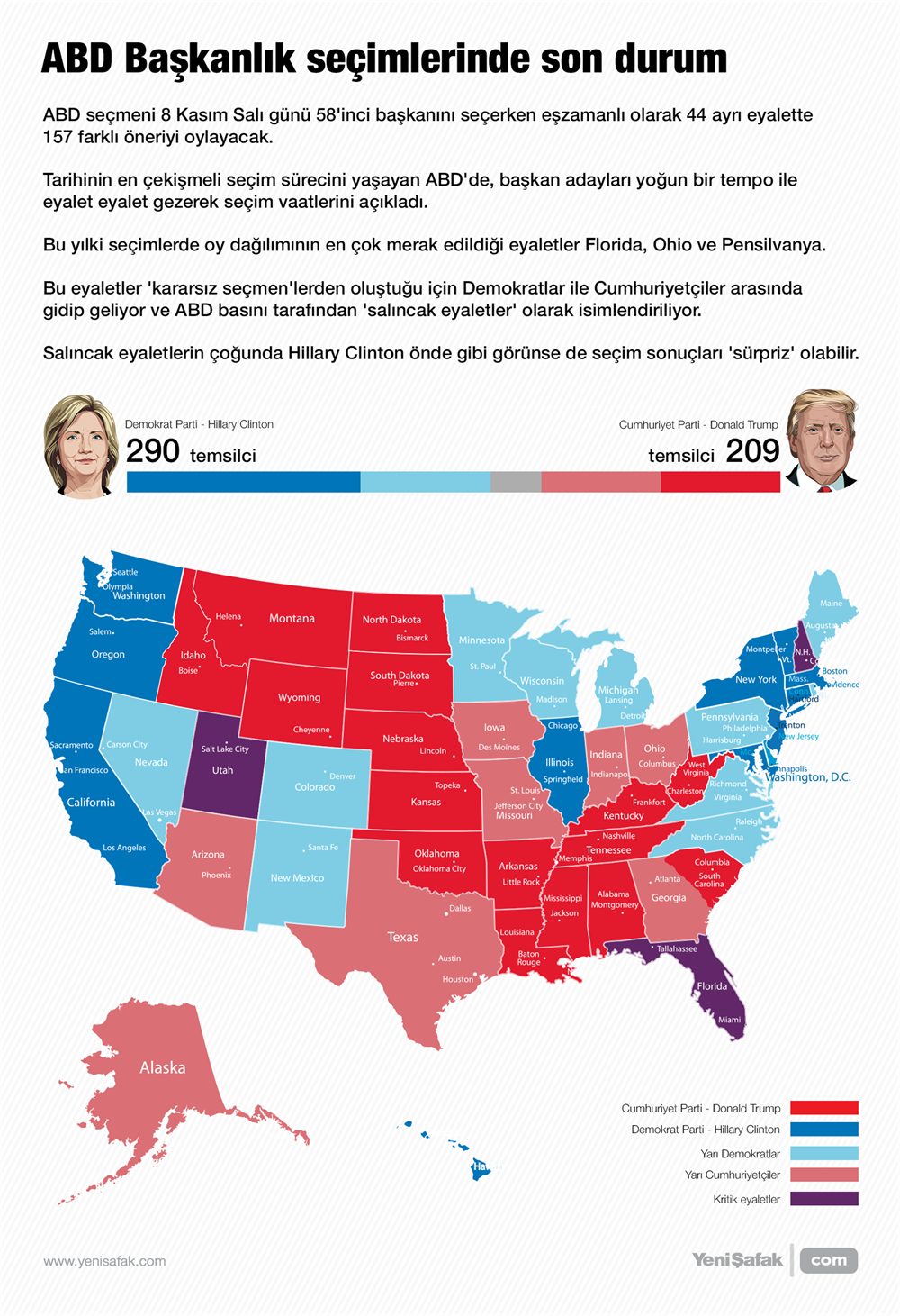 ABD başkanlık seçimlerinde Trump, kritik Florida'yı aldıktan sonra, şimdi de Kuzey Carolina eyaletini aldı. Trump'ın delege sayısı 232'ye ulaştı.