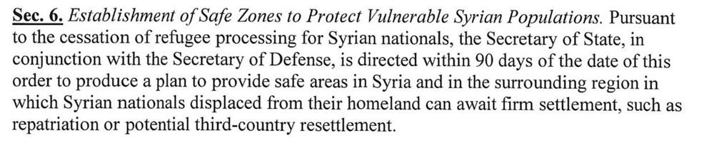 Trump'ın hazırladığı öne sürülen 'Yabancıların Terörist Saldırılarından Ülkeyi Korumak' başlıklı taslağın altıncı maddesinde 'Suriye halkının korunması için güvenli bölgeler oluşturulması' öneriliyor. Taslak metinde Pentagon ve Dışişleri'nin, Suriye'de ve komşu ülkelerde güvenli bölgeler oluşturulması için 3 ay içinde taslak bir plan hazırlaması öngörülüyor: