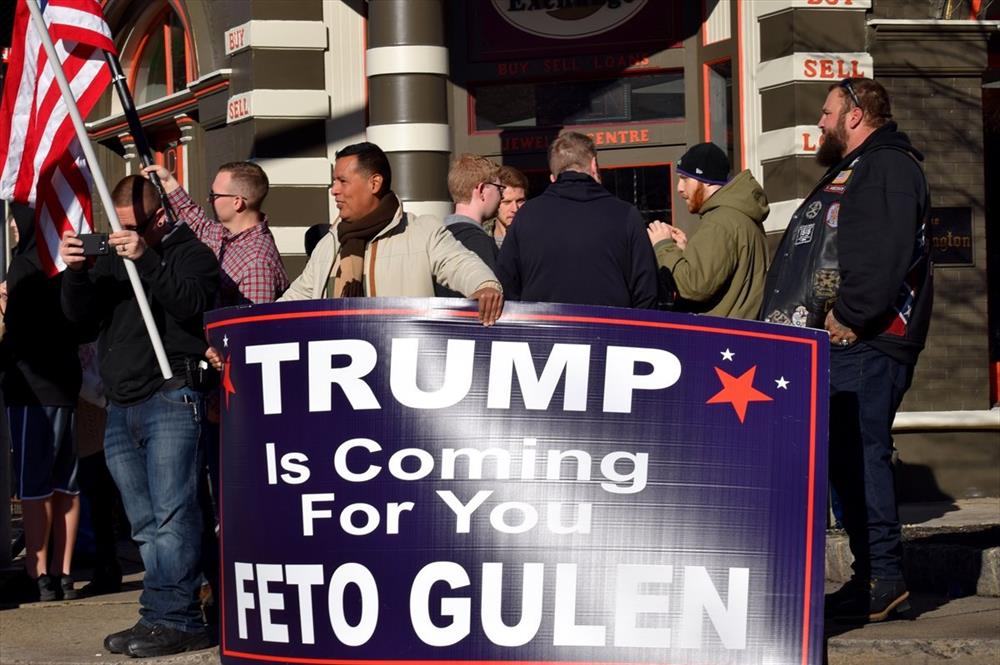 Trump destekçileri, Gülen'i işaret ederek üzerinde "Trump senin için geliyor FETO Gülen" (Trump is coming for you FETO Gulen) ifadesinin yer aldığı pankartı taşıdı.