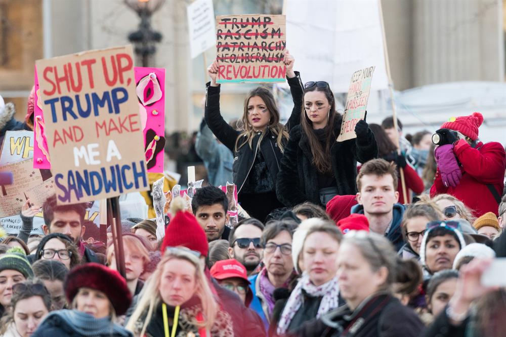 Göstericiler, "Benim başkanım değil", "Trump'ı yargılayın", "Benim bedenim benim kararım," "Eşit ücret ve eşit haklar", "Kadın hakkı insan hakkıdır" yazılı pankartlar taşıdı.