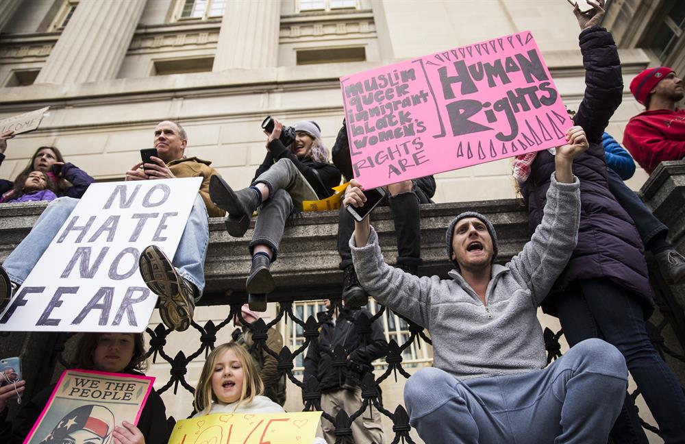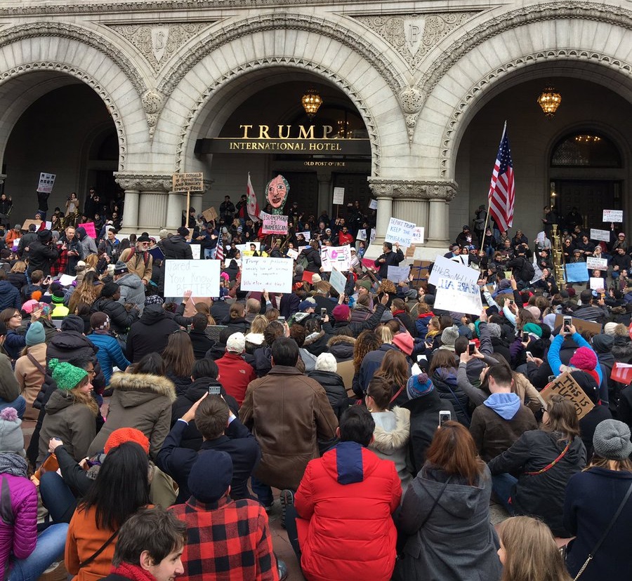 ABD başkentindeki "The Washington Trump International Hotel" önünde toplanan binlerce gösterici Trump aleyhinde slogan attı. Göstericiler Trump'ın ırkçı söylemlerini eleştirdiler ve Trump'ın ABD'nin değerlerini temsil etmediğini belirttiler.