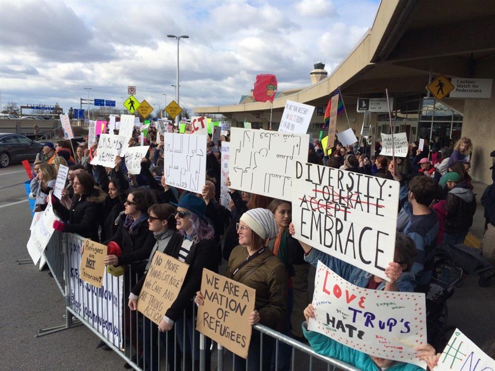 Seattle'daki Tacoma Uluslararası Havalimanı'nda yaklaşık 3000 eylemci 'Nefret yok, korku yok, göçmenler hoş geldi" ve 'Onları içeri alın' sloganları atmıştı.