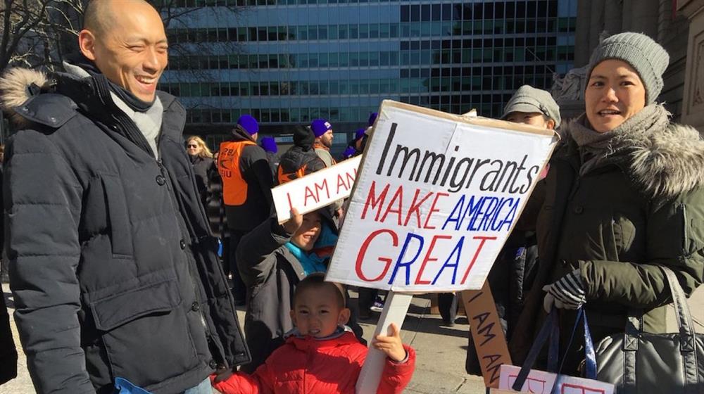 Çoğunluğunu Amerikalı Müslümanların oluşturduğu, ancak diğer dinlere mensup Amerikalıların da ciddi destek verdiği gösteride "Hepimiz göçmeniz" ve "Burası bizim evimiz" gibi sloganlar atıldı.