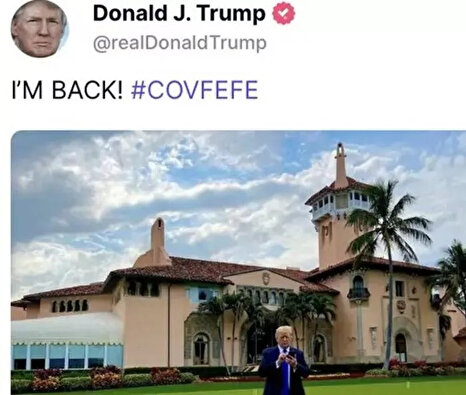- Mar-a-Lago'daki malikanesinde bir elinde cep telefonuyla çekilmiş bir fotoğrafını paylaşan Trump, fotoğraf açıklaması olarak da "DÖNDÜM!#COVFEFE" ifadelerini kullandı.