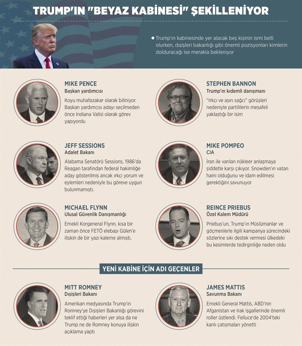 ABD ve uluslararası kamuoyu, sürpriz bir zaferle ABD'nin 45. Başkanı seçilen Donald Trump'ın yeni kabinesine gelecek kilit isimlerin açıklanmasını bekliyor.