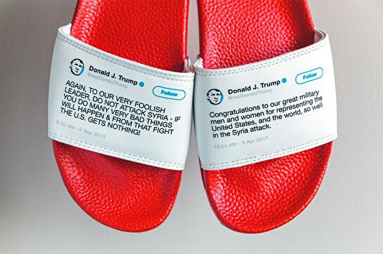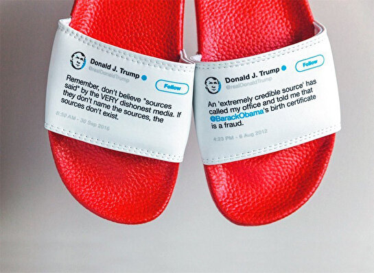 Donald Trump’ın birbiriyle çelişen ifadeler kullandığını vurgulamak isteyen tasarımcı Sam Morrison, ABD başkanının tweet’lerinin yer aldığı terlikler hazırladı. Terliklerden birinde bulunan tweet, diğerini yalanlar nitelikte. Bu ilginç konseptin bazı örnekleri şunlar: