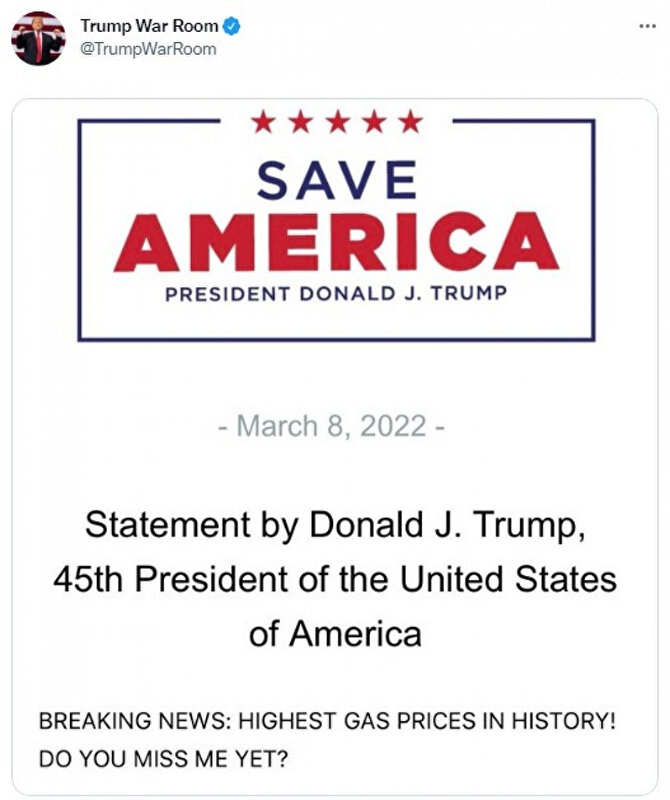 - Trump, paylaşımında"Gaz fiyatları tarihin en yükseğine çıktı. Beni hala özlemediniz mi?"ifadelerini kullandı.