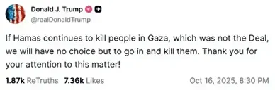 Gazze'de ilan edilen ateşkese atıfta bulunan ABD Başkanı Donald Trump, Hamas'ı tehdit etti. Anlaşmanın bir parçası olmadığına atıfta bulunan Trump, "Eğer Hamas Gazze'de insan öldürmeye devam ederse içeri girip onları öldürmekten başka seçeneğimiz kalmayacak." ifadelerini kullandı.