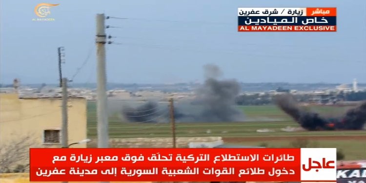 Hizbullah'a yakın Al Mayadeen kanalı Esed rejimine bağlı teröristlerin Afrin'e girişlerini canlı yayın olarak verdi. Mayadeen'in canlı yayın verdiği sıralarda Türk Silahlı Kuvvetleri'ne bağlı İnsansız Hava Araçları da (İHA) konvoyu izlerken sınırdaki topçu birlikleri de teröristleri ateş altına aldı. Kanal, topçuların konvoyu vurma anını kısa bir süre verdikten sonra canlı yayından çıktı.
